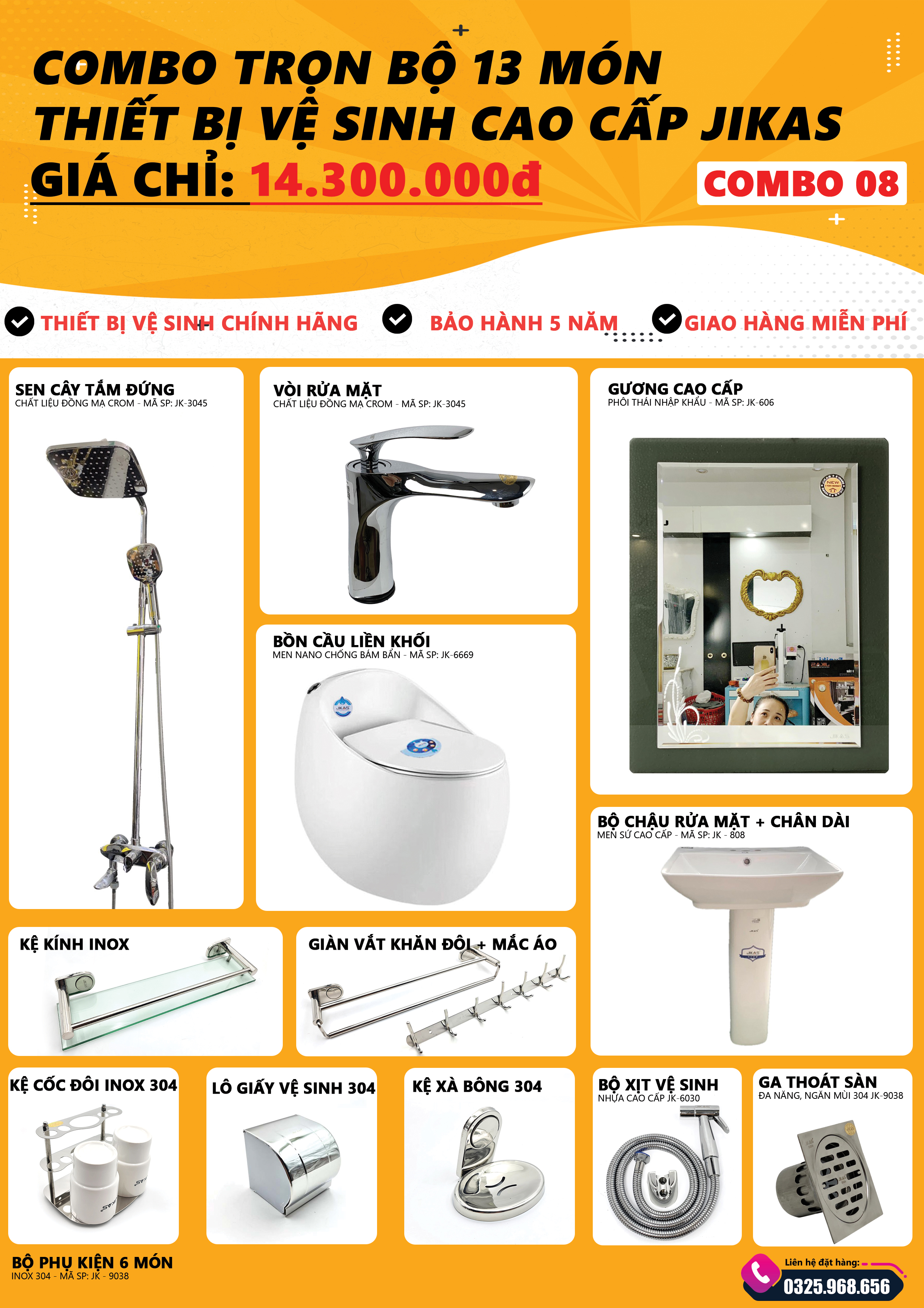 Combo trọn bộ thiết bị phòng tắm: bao gồm đầy đủ phụ kiện trong nhà vệ sinh các sản phẩm mang thương hiệu JIkas Việt Nam, cam kết hàng chính hãng đổi mới khi sản phẩm bị lỗi trong vòng 5 năm.